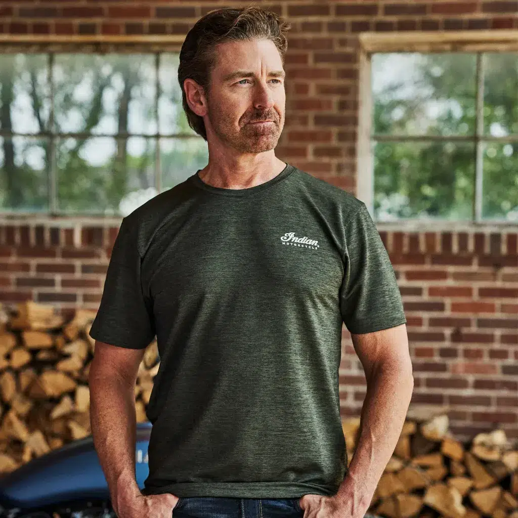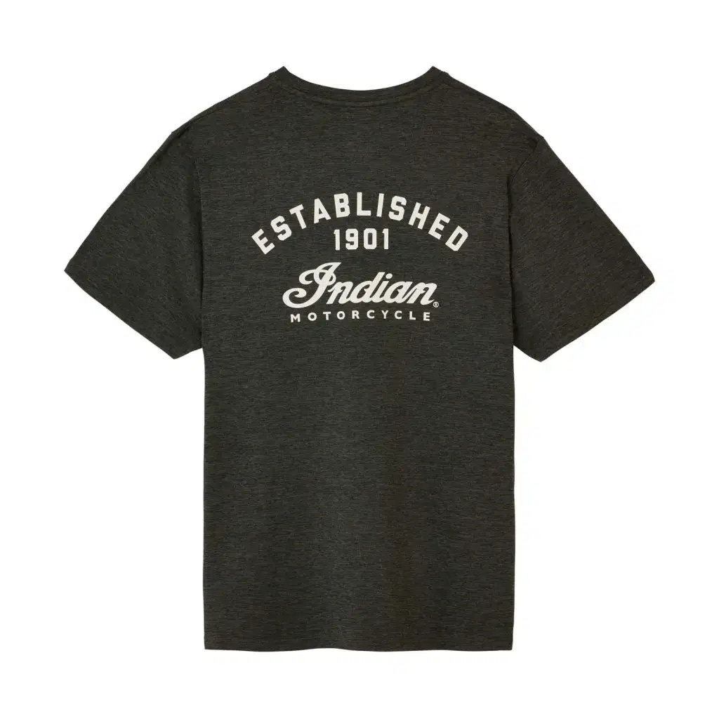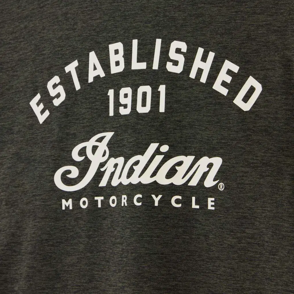 Arka kısımda büyük baskı Indian Motorcycle grafik tasarımı, ön kısımda küçük yazı tipi logo