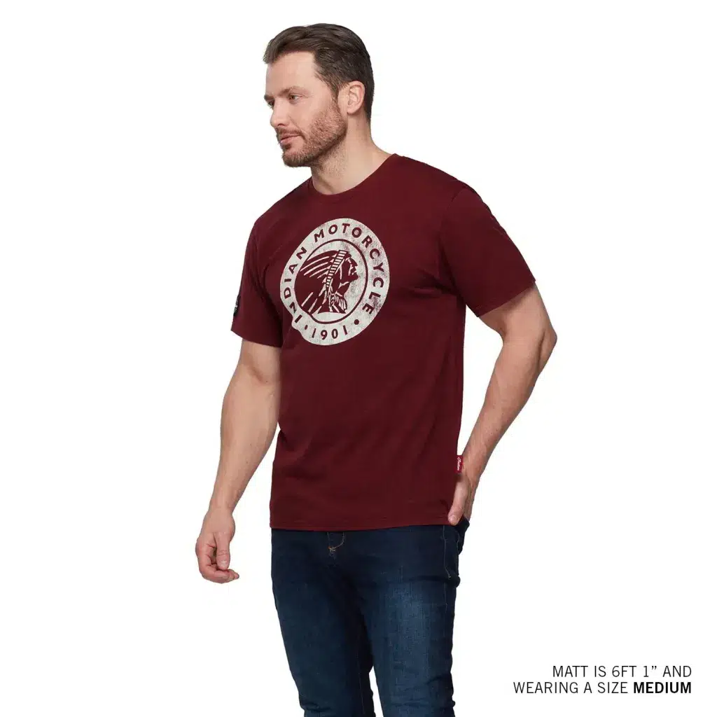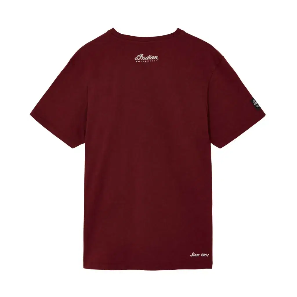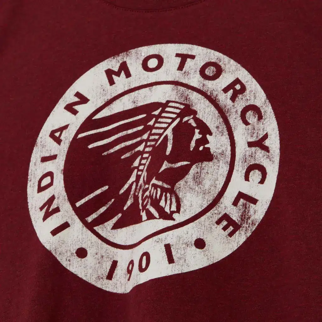 Ön kısımda büyük baskı Indian Motorcycle headdress grafik tasarımı, arka kısımda küçük yazı tipi logo
