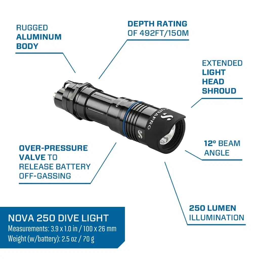 Yeni SCUBAPRO Nova 250, en küçük BCD cebine sığabilecek çok yönlü bir dalış lambasıdır. Üç modu vardır: %100 güç, %50 güç ve flaş modu. Ayrıca, bataryadan çıkan gazı serbest bırakan bir aşırı basınç valfi ile donatılmıştır, bu da onu piyasadaki en güvenli küçük lamba yapar. 250 lümen aydınlatma sağlar ve CR123 pil ile çalışır (şarj edilebilir veya tek kullanımlık). Tek kullanımlık CR123 pilin raf ömrü 10 yıla kadar olduğu için, kış boyunca BCD cebinde bırakmanız halinde endişelenmenize gerek yoktur.