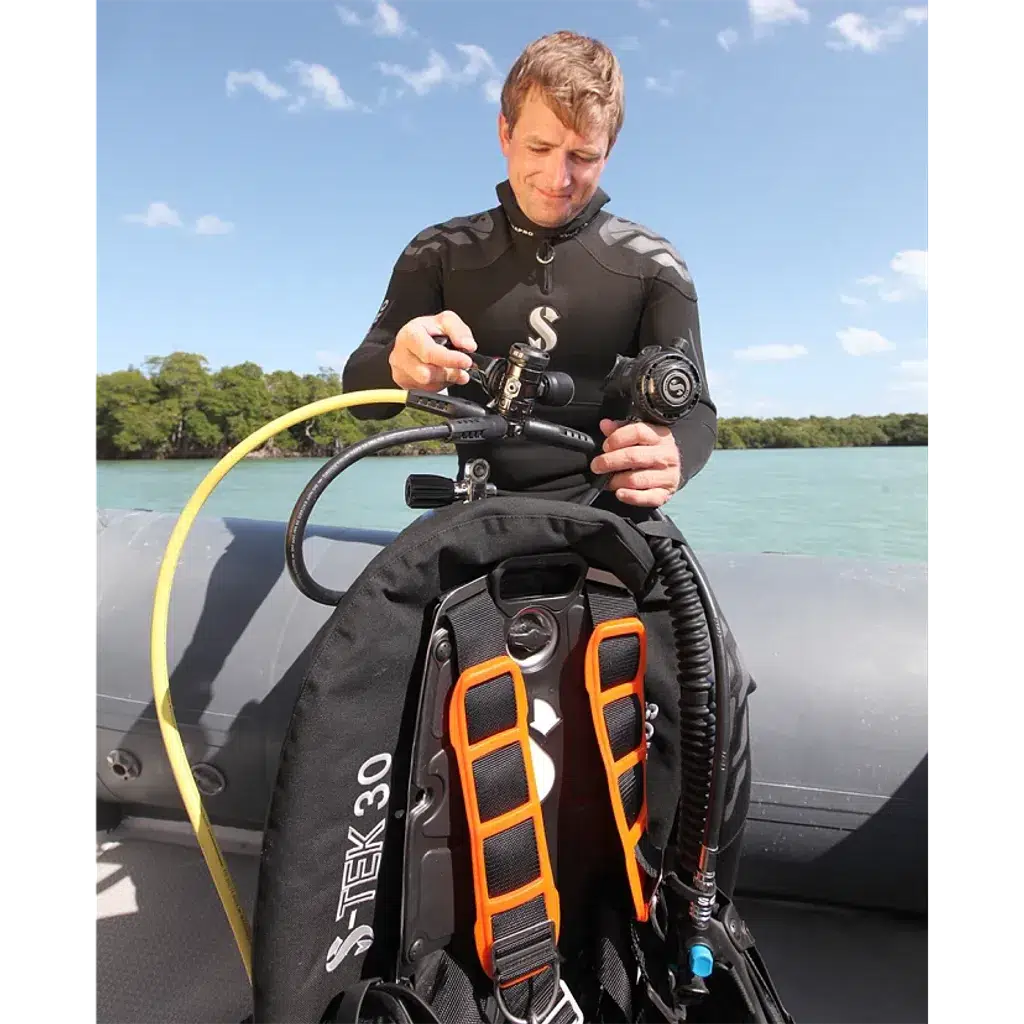 S-Tek Tek Tank Adaptörü, çift tüplü dalıştan tek tüplü dalışa geçiş yapmanın pratik bir yoludur.